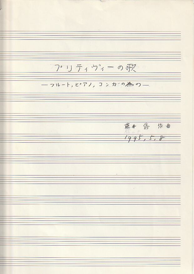 フルート、ピアノ、コンガの為の「プリティヴィーの歌」 (手書きスコア、手書きフルートパート譜、手書きコンガパート譜) インドの地の神、プリティヴィーから着想を得た現代音楽。 1995年作品